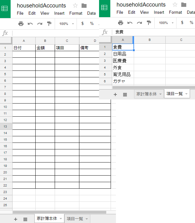 すなわち、日付、金額、項目、備考を入力する家計簿本体入力用シートと、項目の種類を一覧した項目一覧のシートである。項目一覧には使うことが決まっている項目を記入しておく。なお、内容は我が家で使っているものではない。夫婦共にソシャゲをやらずに「くまのプーさんのホームランダービー!」ばかりやっているからだ。