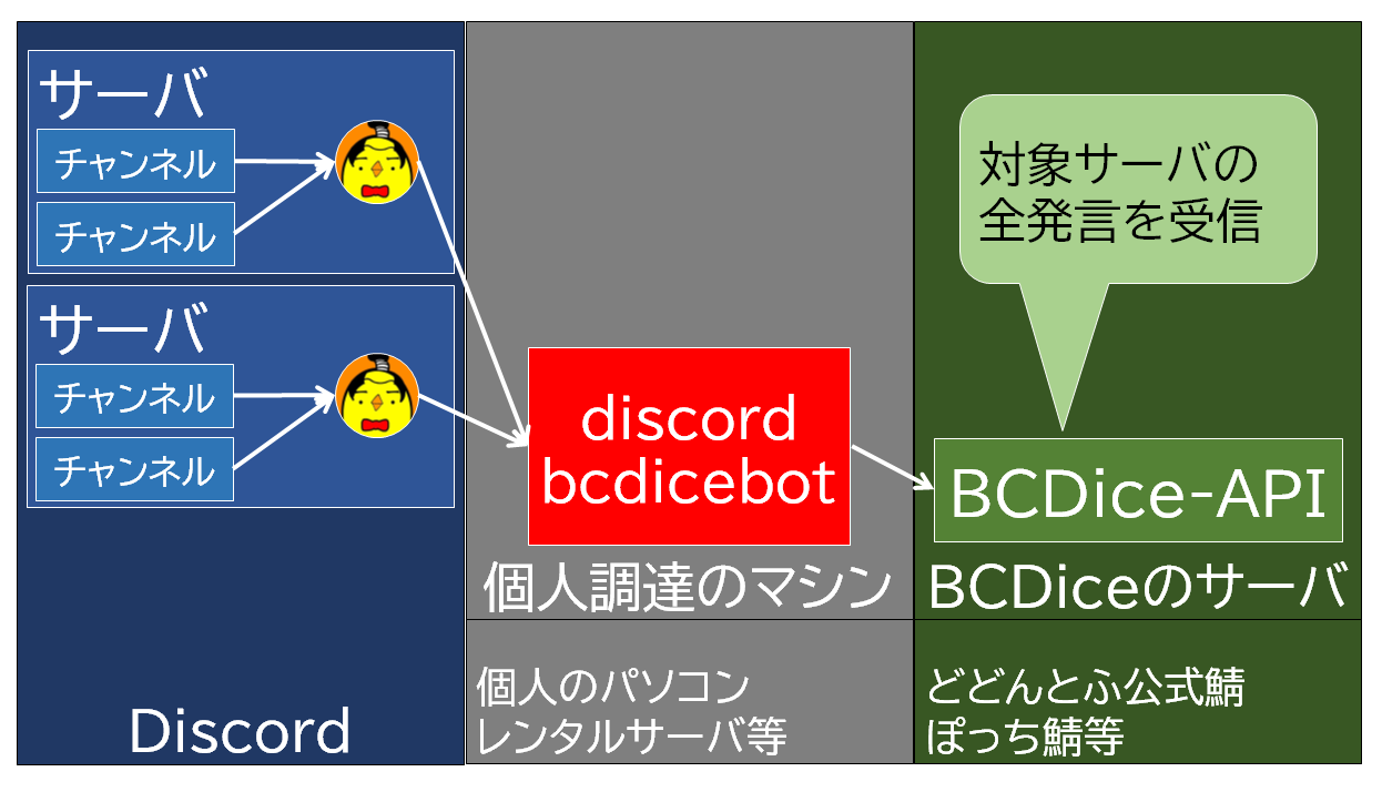 私が作った discord-bcdicebot は稼働している間、Bot を経由して各サーバに存在するチャンネルを監視・すべての発言を取得する。その上で bcdice-api に取得した発言をすべて送信している。よって、bcdice-api が置いてあるサーバに全チャンネルの発言が送信されていることになる。