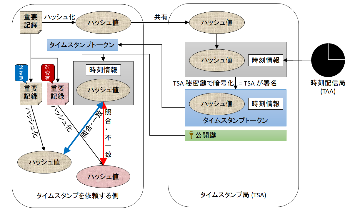 しかし、タイムスタンプトークンに付加されたハッシュ値は誰でも確認できるとはいえ、暗号学的ハッシュによって作成された値である。同じハッシュ値を得られる入力データを特定することは現実的に不可能である。