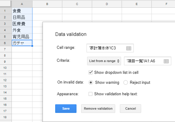これで、項目欄はドロップダウンで入力ができるようになった。瞬時に入力できるので、あなたの夫ないし妻がズボラでも入力できるはずだ。
