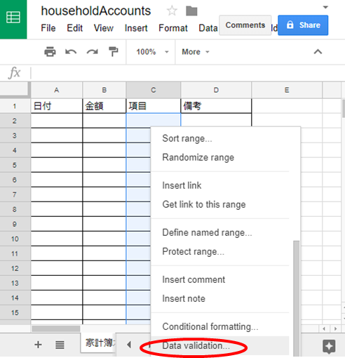 ドロップダウン入力を実現するには Data validation (日本語:データの入力規則) を使う。項目の入力セルを右クリックし、Data validation を選択する。