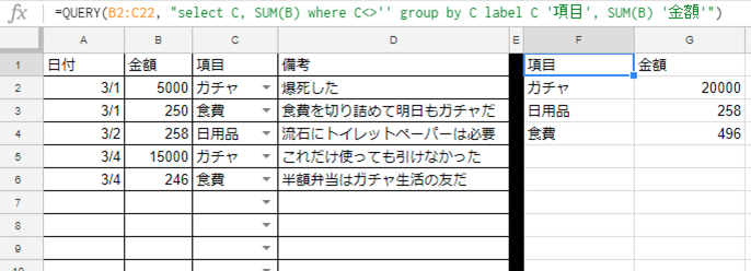 今回のサンプルでは次ようなクエリを書いてみた。=QUERY(B2:C22, "select C, SUM(B) where C<>'' group by C label C '項目', SUM(B) '金額'")