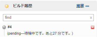 <table page-has-up="false" page-has-down="false" page-entry-newest="1" page-entry-oldest="1" class="pane hasPageData"><tr page-entry-id="1" id="1" class="build-row build-pending transitive single-line"><td class="build-row-cell"><div class="pane build-name"><div class="build-icon"><img src="/jenkins/static/18f476c2/images/16x16/grey.png" style="width: 16px; height: 16px; " class="icon-grey icon-sm" /></div><div title="Expected build number" class="display-name">#4</div></div><div class="pane build-details indent-multiline"> (pending—待機中です。あと5 時間 21 分です。) </div><div class="pane build-controls"><div class="build-stop"><a onclick="new Ajax.Request("/jenkins/queue/cancelItem?id=1"); return false;" href="/jenkins/queue/cancelItem?id=1" class="stop-button-link"><img src="/jenkins/static/18f476c2/images/16x16/stop.png" style="width: 16px; height: 16px; " class="icon-stop icon-sm" /></a></div></div><div class="left-bar"></div></td></tr></table>